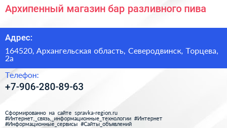 Архипенный, магазин-бар разливного пива по адресу 164520, Архангельская область, Северодвинск, Торцева, 2а в дальнейшем Организация, размещена в следующих категориях: