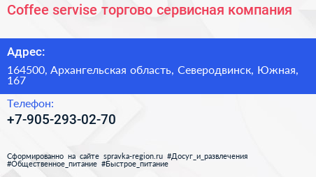 Coffee servise, торгово-сервисная компания по адресу 164500, Архангельская область, Северодвинск, Южная, 167 в дальнейшем Организация, размещена в следующих категориях: