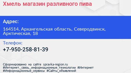 Хмель, магазин разливного пива по адресу 164514, Архангельская область, Северодвинск, Арктическая, 18 в дальнейшем Организация, размещена в следующих категориях: