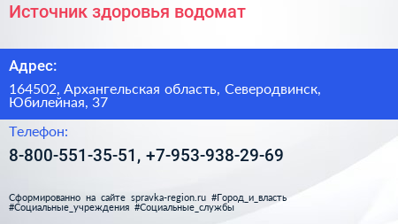 Источник здоровья, водомат по адресу 164502, Архангельская область, Северодвинск, Юбилейная, 37 в дальнейшем Организация, размещена в следующих категориях: