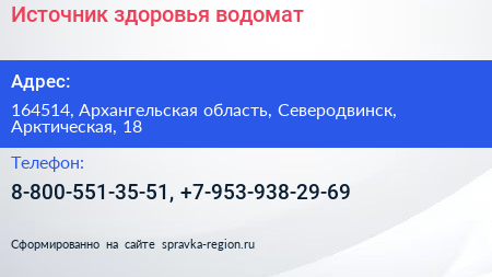 Источник здоровья, водомат по адресу 164514, Архангельская область, Северодвинск, Арктическая, 18 в дальнейшем Организация, размещена в следующих категориях: