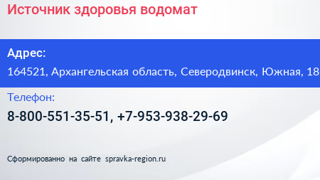 Источник здоровья, водомат по адресу 164521, Архангельская область, Северодвинск, Южная, 18 в дальнейшем Организация, размещена в следующих категориях: