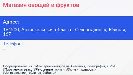 Магазин овощей и фруктов по адресу 164500, Архангельская область, Северодвинск, Южная, 167 в дальнейшем Организация, размещена в следующих категориях: