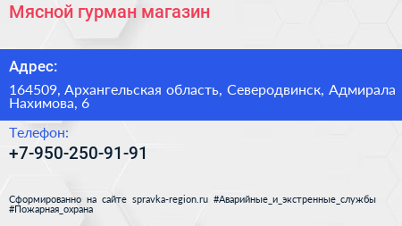 Мясной гурман, магазин по адресу 164509, Архангельская область, Северодвинск, Адмирала Нахимова, 6 в дальнейшем Организация, размещена в следующих категориях: