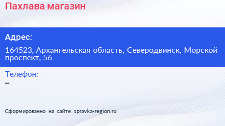 Пахлава, магазин по адресу 164523, Архангельская область, Северодвинск, Морской проспект, 56 в дальнейшем Организация, размещена в следующих категориях:
