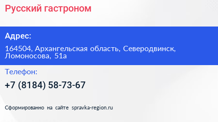 Русский, гастроном по адресу 164504, Архангельская область, Северодвинск, Ломоносова, 51а в дальнейшем Организация, размещена в следующих категориях: