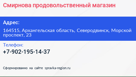 Смирнова, продовольственный магазин по адресу 164515, Архангельская область, Северодвинск, Морской проспект, 23 в дальнейшем Организация, размещена в следующих категориях:
