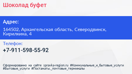 Шоколад, буфет по адресу 164502, Архангельская область, Северодвинск, Кирилкина, 4 в дальнейшем Организация, размещена в следующих категориях:
