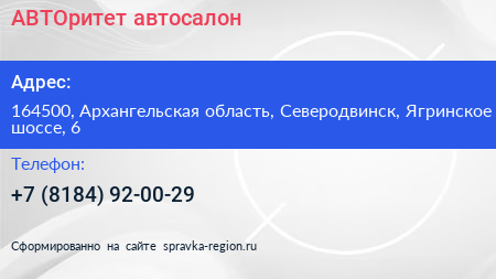 АВТОритет, автосалон по адресу 164500, Архангельская область, Северодвинск, Ягринское шоссе, 6 в дальнейшем Организация, размещена в следующих категориях: