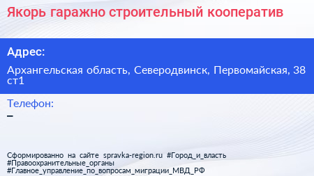 Якорь, гаражно-строительный кооператив по адресу Архангельская область, Северодвинск, Первомайская, 38 ст1 в дальнейшем Организация, размещена в следующих категориях: