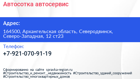 Автосотка, автосервис по адресу 164500, Архангельская область, Северодвинск, Северо-Западная, 12 ст23 в дальнейшем Организация, размещена в следующих категориях: