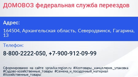 ДОМОВОЗ, федеральная служба переездов по адресу 164504, Архангельская область, Северодвинск, Гагарина, 13 в дальнейшем Организация, размещена в следующих категориях: