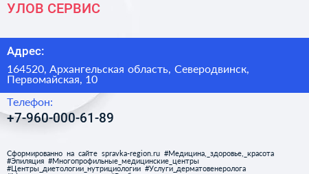 УЛОВ-СЕРВИС по адресу 164520, Архангельская область, Северодвинск, Первомайская, 10 в дальнейшем Организация, размещена в следующих категориях: