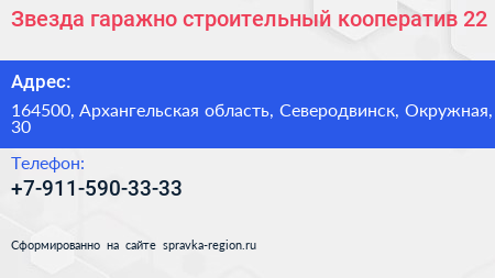 Звезда, гаражно-строительный кооператив №22 по адресу 164500, Архангельская область, Северодвинск, Окружная, 30 в дальнейшем Организация, размещена в следующих категориях: