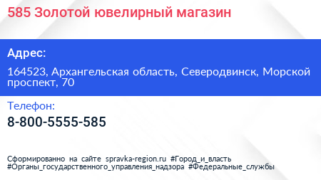 585 Золотой, ювелирный магазин по адресу 164523, Архангельская область, Северодвинск, Морской проспект, 70 в дальнейшем Организация, размещена в следующих категориях: