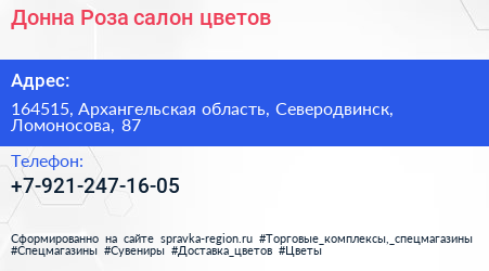 Донна Роза, салон цветов по адресу 164515, Архангельская область, Северодвинск, Ломоносова, 87 в дальнейшем Организация, размещена в следующих категориях: