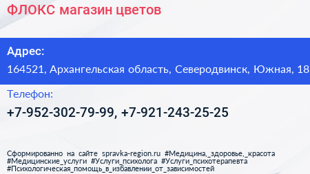 ФЛОКС, магазин цветов по адресу 164521, Архангельская область, Северодвинск, Южная, 18 в дальнейшем Организация, размещена в следующих категориях:
