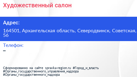 Художественный салон по адресу 164501, Архангельская область, Северодвинск, Советская, 56 в дальнейшем Организация, размещена в следующих категориях: