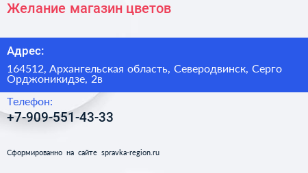 Желание, магазин цветов по адресу 164512, Архангельская область, Северодвинск, Серго Орджоникидзе, 2в в дальнейшем Организация, размещена в следующих категориях: