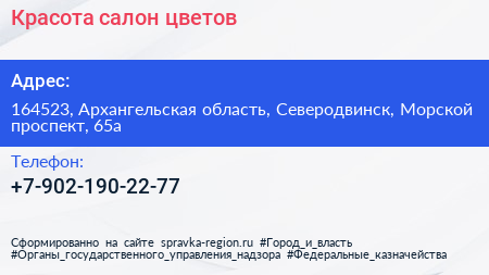 Красота, салон цветов по адресу 164523, Архангельская область, Северодвинск, Морской проспект, 65а в дальнейшем Организация, размещена в следующих категориях:
