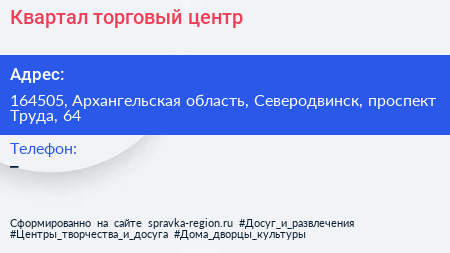 Квартал, торговый центр по адресу 164505, Архангельская область, Северодвинск, проспект Труда, 64 в дальнейшем Организация, размещена в следующих категориях: