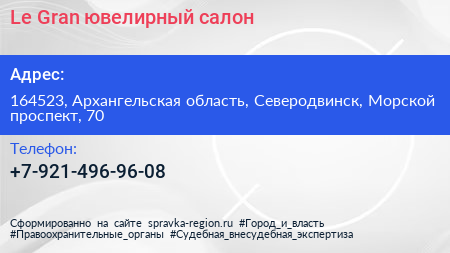Le Gran, ювелирный салон по адресу 164523, Архангельская область, Северодвинск, Морской проспект, 70 в дальнейшем Организация, размещена в следующих категориях: