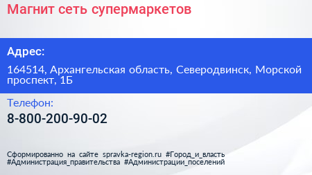 Магнит, сеть супермаркетов по адресу 164514, Архангельская область, Северодвинск, Морской проспект, 1Б в дальнейшем Организация, размещена в следующих категориях: