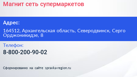 Магнит, сеть супермаркетов по адресу 164512, Архангельская область, Северодвинск, Серго Орджоникидзе, 8 в дальнейшем Организация, размещена в следующих категориях: