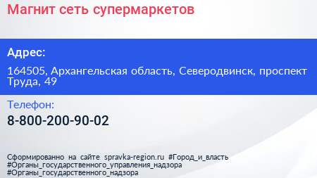 Магнит, сеть супермаркетов по адресу 164505, Архангельская область, Северодвинск, проспект Труда, 49 в дальнейшем Организация, размещена в следующих категориях: