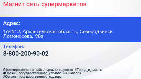 Магнит, сеть супермаркетов по адресу 164512, Архангельская область, Северодвинск, Ломоносова, 98а в дальнейшем Организация, размещена в следующих категориях: