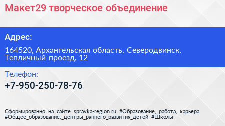 Макет29, творческое объединение по адресу 164520, Архангельская область, Северодвинск, Тепличный проезд, 12 в дальнейшем Организация, размещена в следующих категориях: