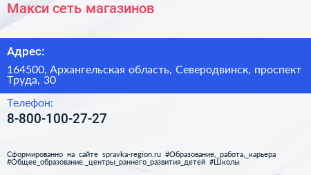 Макси, сеть магазинов по адресу 164500, Архангельская область, Северодвинск, проспект Труда, 30 в дальнейшем Организация, размещена в следующих категориях: