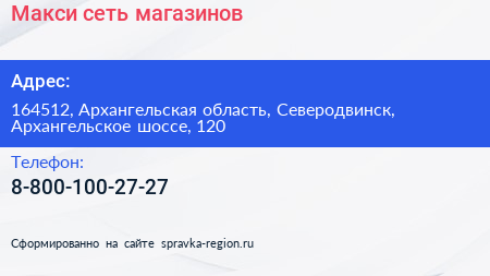 Макси, сеть магазинов по адресу 164512, Архангельская область, Северодвинск, Архангельское шоссе, 120 в дальнейшем Организация, размещена в следующих категориях: