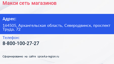Макси, сеть магазинов по адресу 164505, Архангельская область, Северодвинск, проспект Труда, 72 в дальнейшем Организация, размещена в следующих категориях: