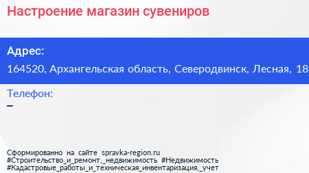 Настроение, магазин сувениров по адресу 164520, Архангельская область, Северодвинск, Лесная, 18 в дальнейшем Организация, размещена в следующих категориях:
