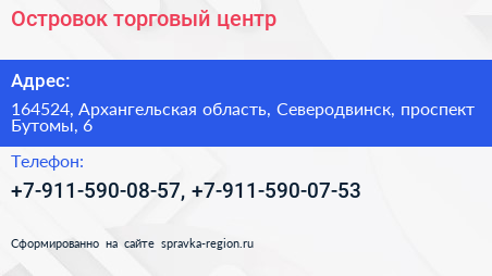 Островок, торговый центр по адресу 164524, Архангельская область, Северодвинск, проспект Бутомы, 6 в дальнейшем Организация, размещена в следующих категориях: