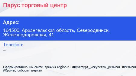Парус, торговый центр по адресу 164500, Архангельская область, Северодвинск, Железнодорожная, 41 в дальнейшем Организация, размещена в следующих категориях: