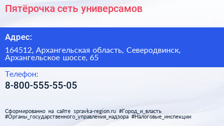 Пятёрочка, сеть универсамов по адресу 164512, Архангельская область, Северодвинск, Архангельское шоссе, 65 в дальнейшем Организация, размещена в следующих категориях: