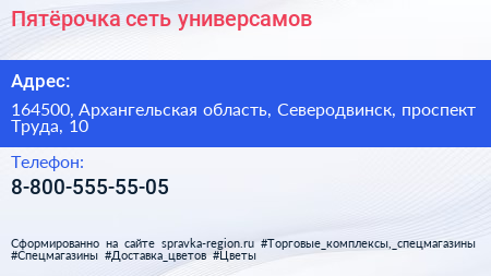 Пятёрочка, сеть универсамов по адресу 164500, Архангельская область, Северодвинск, проспект Труда, 10 в дальнейшем Организация, размещена в следующих категориях: