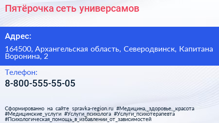 Пятёрочка, сеть универсамов по адресу 164500, Архангельская область, Северодвинск, Капитана Воронина, 2 в дальнейшем Организация, размещена в следующих категориях: