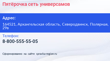 Пятёрочка, сеть универсамов по адресу 164521, Архангельская область, Северодвинск, Полярная, 29в в дальнейшем Организация, размещена в следующих категориях: