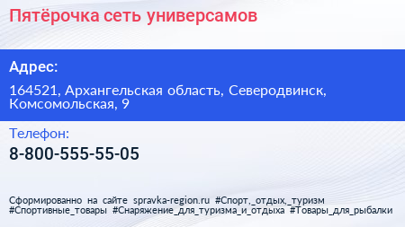 Пятёрочка, сеть универсамов по адресу 164521, Архангельская область, Северодвинск, Комсомольская, 9 в дальнейшем Организация, размещена в следующих категориях: