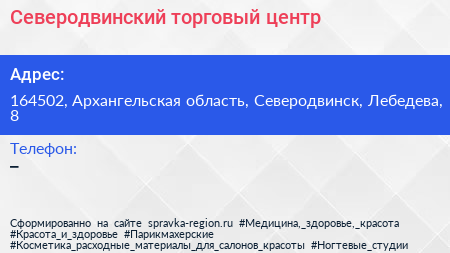 Северодвинский, торговый центр по адресу 164502, Архангельская область, Северодвинск, Лебедева, 8 в дальнейшем Организация, размещена в следующих категориях: