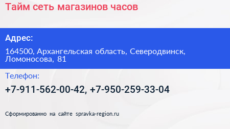 Тайм, сеть магазинов часов по адресу 164500, Архангельская область, Северодвинск, Ломоносова, 81 в дальнейшем Организация, размещена в следующих категориях: