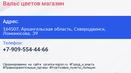 Вальс цветов, магазин по адресу 164507, Архангельская область, Северодвинск, Ломоносова, 39 в дальнейшем Организация, размещена в следующих категориях: