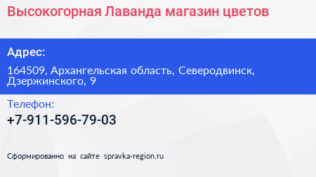 Высокогорная Лаванда, магазин цветов по адресу 164509, Архангельская область, Северодвинск, Дзержинского, 9 в дальнейшем Организация, размещена в следующих категориях: