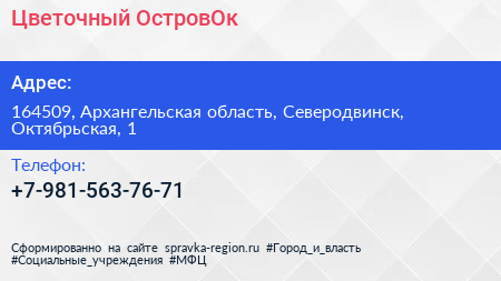 Цветочный ОстровОк по адресу 164509, Архангельская область, Северодвинск, Октябрьская, 1 в дальнейшем Организация, размещена в следующих категориях: