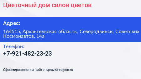 Цветочный дом, салон цветов по адресу 164515, Архангельская область, Северодвинск, Советских Космонавтов, 14а в дальнейшем Организация, размещена в следующих категориях: