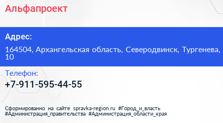 Альфапроект по адресу 164504, Архангельская область, Северодвинск, Тургенева, 10 в дальнейшем Организация, размещена в следующих категориях: