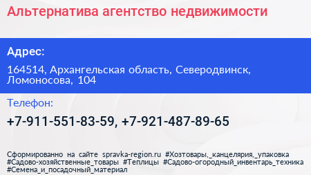Альтернатива, агентство недвижимости по адресу 164514, Архангельская область, Северодвинск, Ломоносова, 104 в дальнейшем Организация, размещена в следующих категориях: